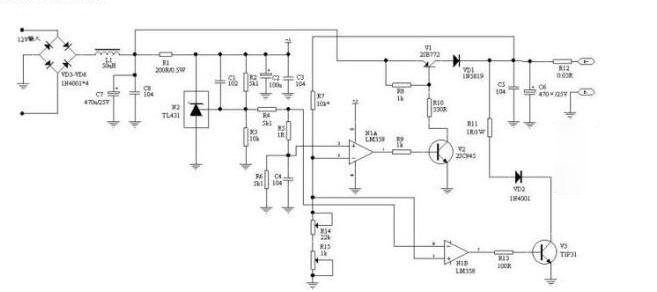 220V市電經變壓器降壓后,得到12V左右的不穩(wěn)定交流電壓,該電壓經VD3-VD6整流,經L1、C7濾波后,得到不穩(wěn)定的12V直流電,N2、R1-R6、C2構成穩(wěn)壓電路,其輸出為穩(wěn)定的5V電源,該電源提供給LM358運算放大器,作為LM358的電源使用。N2的第一腳為恒定的2.5V,作為基準電壓經分壓后提供給LM358作比較用。