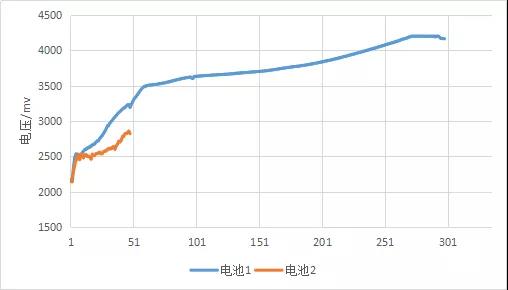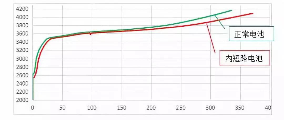 圖三是在實際生產中遇到的一個內短路的電池與同批次正常電池的化成曲線對比。如圖中紅色曲線為內短路電池,隨著時間的上升此電池電壓與正常電池越拉越大,同時充電到4.2V,此電池較正常電池的充電時間長了1h左右,而這無形中拖延著整個化成柜的時間。且隨著充電時間的增加,短路點可能越來越大,電池溫度越來越高,隨著溫度的不斷升高,電池內部可能因正極、負極和電解液之間發生各種反應而失控。那能不能提前把這些有問題的電池識別出來呢?