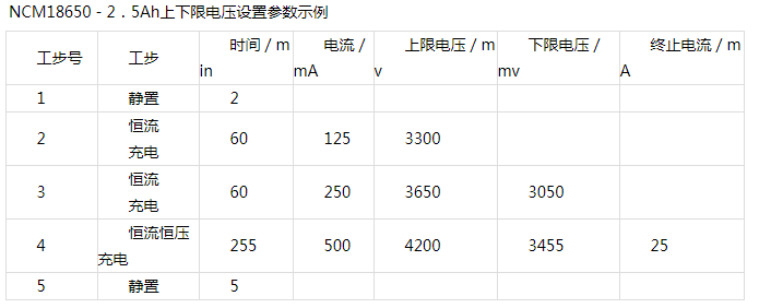 相對于上限電壓的設置,每一步的下限電壓設置其實更為重要。舉個例子,還是上圖三中內短路的電池,假如使用圖二中階梯電流充電,在第二步中設置合適的下限電壓,由于此電池第一步充電結束電壓小于正常電池,那么在跳轉第二步時假如低于設置的下限電壓,那么此電池就會停止充電,從而降低了安全事故發生的概率。