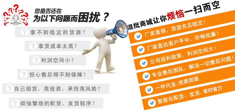 8、一件免費代發:我們秉承長期持續發展,客戶至上的思想,對于網絡代理,即使是一件產品我們也會幫您發貨。這樣也免去你的庫存壓力。培養能夠長期合作的伙伴,共同發展壯大。